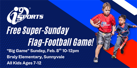 i9 Sports is hosting a Free Super-Sunday Flag-Football Game for children ages 7 to 12. The event takes place on the morning of the "Big Game" (February 8th) at Braly Elementary in Sunnyvale, offering kids a chance to play flag football from 10 AM to noon.